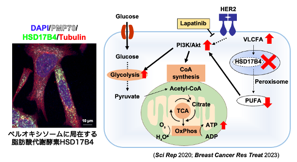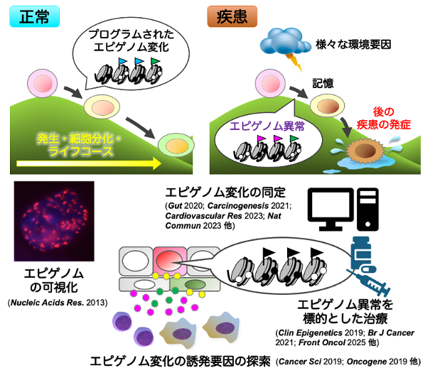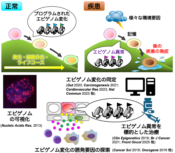 1. 疾患に関わるエピゲノム異常の同定と治療法の開発 エピゲノムには環境要因にどれだけ曝露されたかという経験が記憶されており、将来の疾患に繋がることが知られています。私達は、疾患の発症過程におけるエピゲノム変化の同定、エピゲノム変化を誘発する環境要因の同定、疾患発症に繋がる分子機構の解明を行っています。また、疾患に関わるエピゲノム変化を標的とし、細胞運命の正常化を目指した治療法の開発も行っています。 2. がん代謝と細胞膜変化を介した薬剤感受性機構の解明 細胞膜タンパク質は、細胞外からのシグナルを細胞の性質に変換する重要な役割を担っています。また、膜受容体の標的薬は、がん薬物療法の中心となっています。私達は、膜受容体HER2に対する標的薬の感受性に、脂肪酸代謝酵素が関与していることを見出しました。また、薬剤感受性の増強のメカニズムとして、がん細胞の代謝変換を明らかにしました。現在は、細胞膜変化による膜受容体標的薬の感受性への影響の解析、および、代謝変換を模倣する方法の開発を行なっています。 3. 代謝疾患の治療法開発に向けた新たな代謝制御機構の探索 代謝疾患の発症機序の解明や治療法の開発のためには、代謝制御の根幹を理解することが重要です。興味深いことに、一部の非モデル動物ではヒトと異なるグルコース恒常性の仕組みが存在し、柔軟な代謝を行なっていることが明らかになってきました。私達は、マウスなどのモデル動物に加え、非モデル動物を活用して新たな代謝制御系を探索し、代謝疾患の新規治療法の開発につなげることを目指しています。