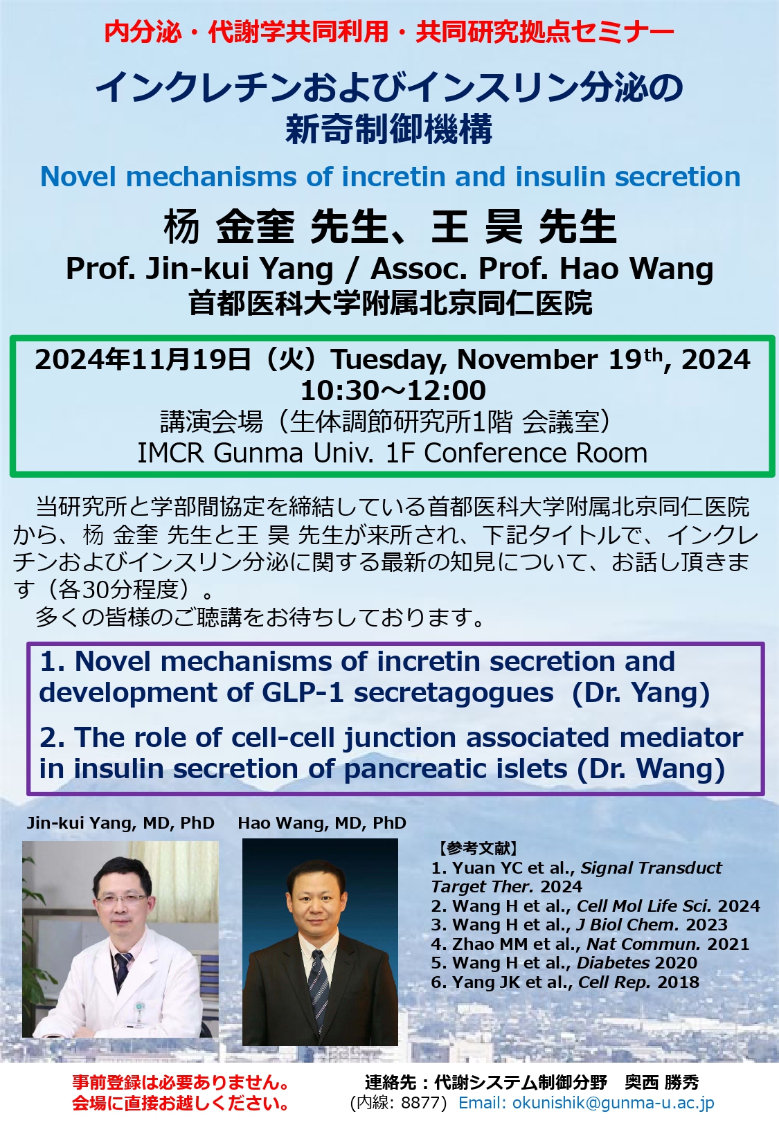 2024.11.19 首都医科大学附属北京同仁医院の杨金奎先生、王昊先生先生をお招きしました。「インクレチンおよびインスリン分泌の新奇制御機構」について、ご講演していただきました。